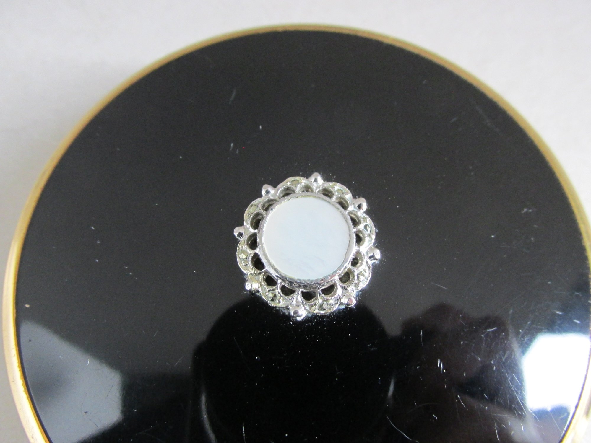 Circular shape. Black enamel top with embellishment mounted in the centre (circular centre of subtle pale iridescent colours, similar to Mother of Pearl, with fancy silver colour metal edging).