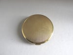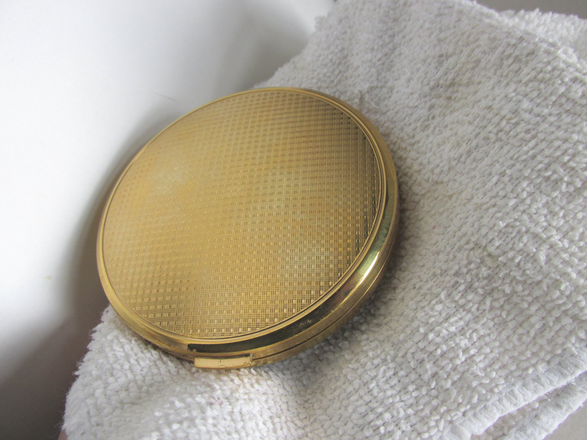 Condition: In used condition. Hinge and catch in working order. Small fine scuff marks on the black top, and tiny spots of wear to the edge of the black. Small ding in the metal to the right of the catch. Bottom of compact has slight wear. The mirror has fine hazy lines under the surface. The interior metal edges have some small spots of tarnish. Paper lining is very good. Powder puff is used, with discolouration marks on the pad (top of puff is very good). Sifter very good. Fabric pouch excellent.