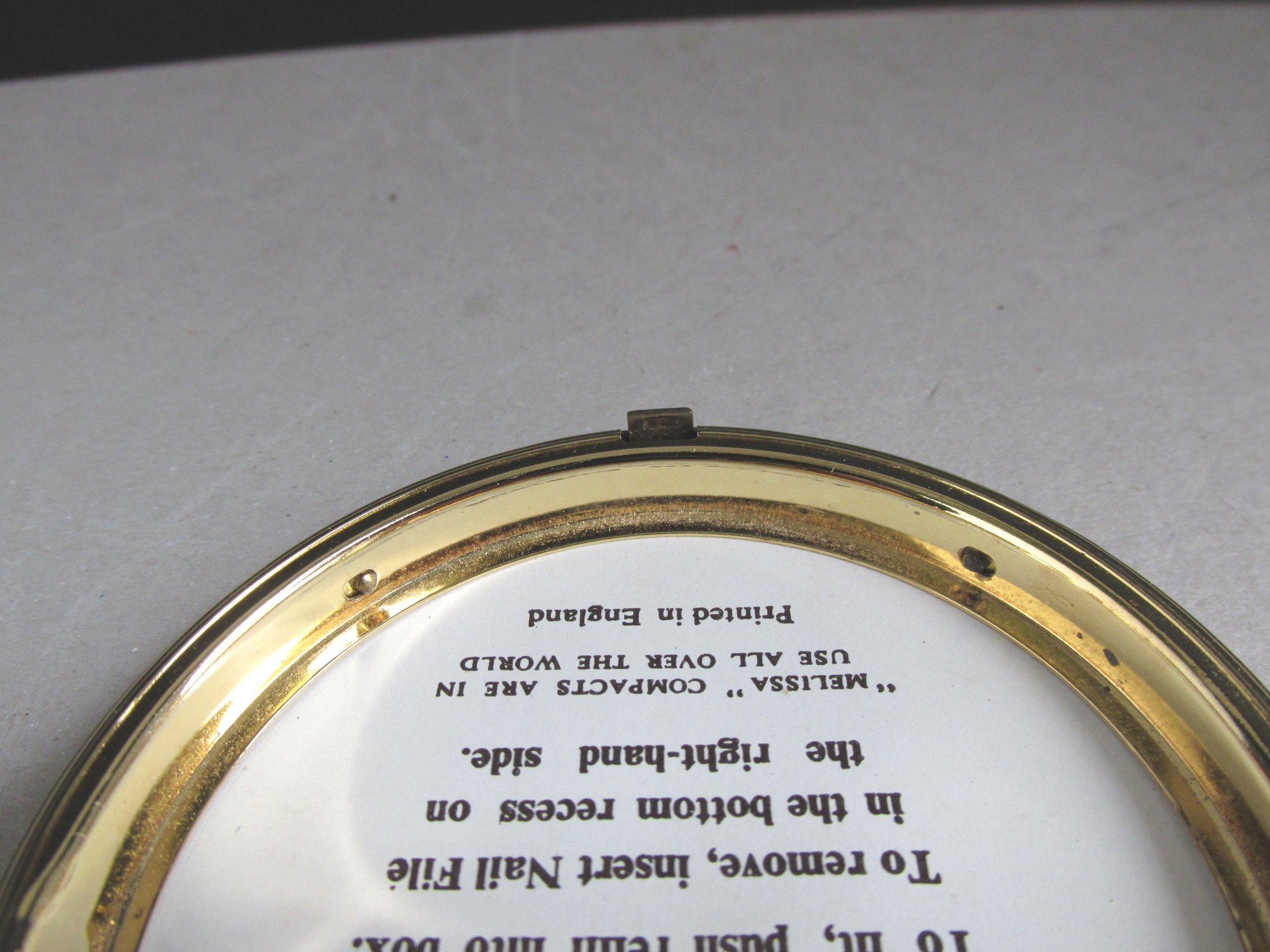 Inside has a mirror in the lid, 'Melissa Made in England' stamped in the metal under the mirror, a Melissa powder puff, removeable powder sifter, and a paper surface on the bottom of the powder well with printed instructions on it.